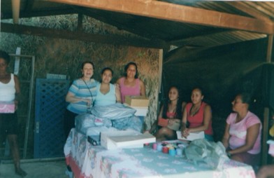Alunas concentradas para início da aula de bordado com Dona Maria Alvarina (blusa listrada em azul e branco) – 2004