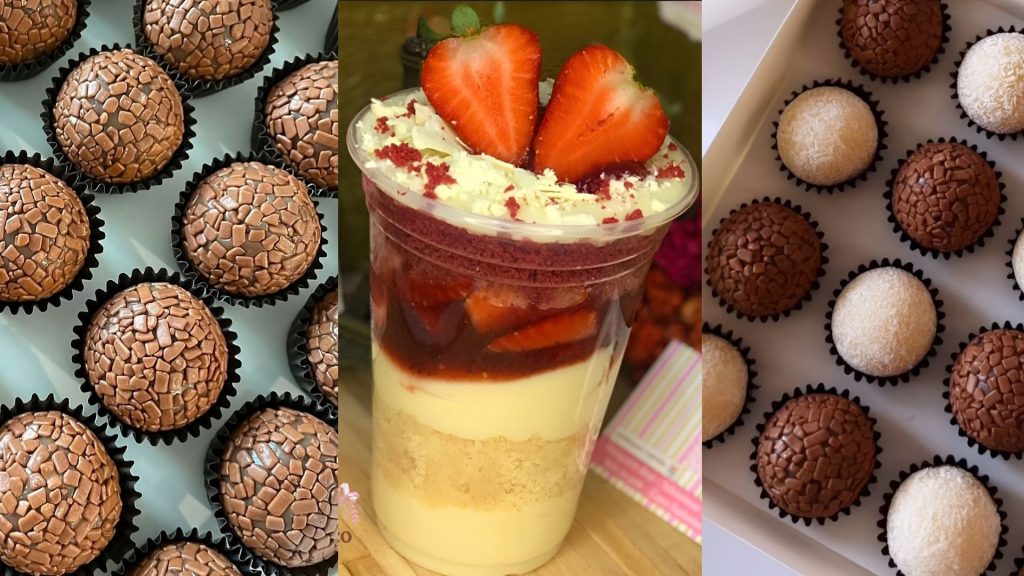 Ana Karolina começou a perceber que havia uma nova receita para partilhar no “Dia dos Namorados”. Por isso, decidiu fazê-lo. Era um doce composto por 4 pequenos compartimentos que continham ganache, recheio, e frutas, como morango e uva, “porque eram as frutas mais baratas na altura”, recorda.