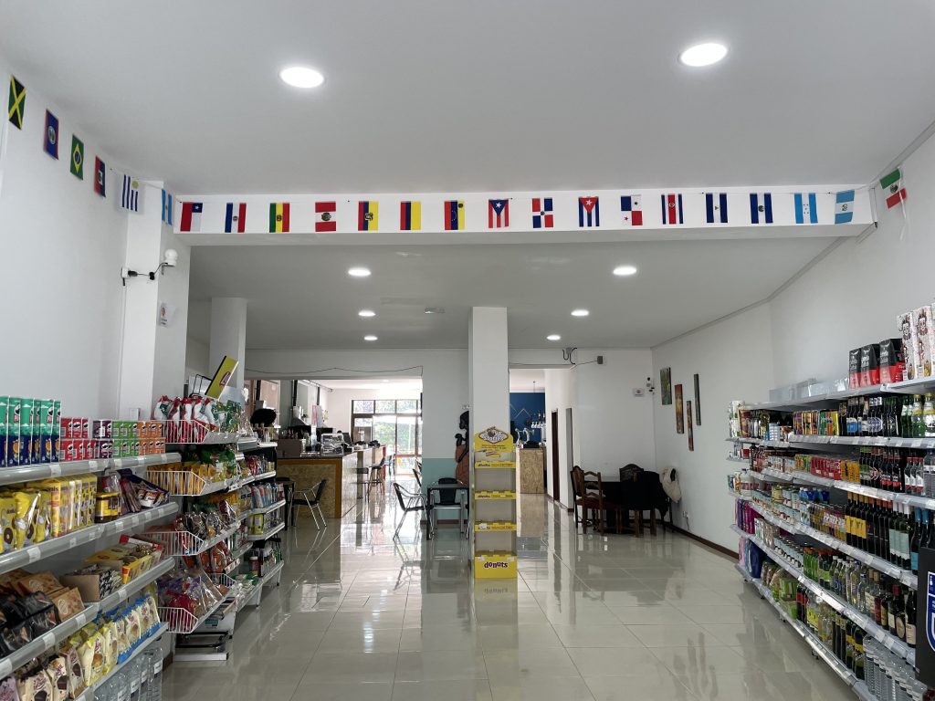 Ao entrar no número 368, da rua do Bonfim, a primeira impressão que o nosso olhar capta, é uma faixa com todas as bandeiras dos países da América Latina a percorrer a parede da entrada. Assim como, as prateleiras que abrigam produtos e comida de várias zonas da América do Sul, desde bolachas, chocolates, tostas, refrigerantes, enlatados e bebidas espirituais. Não tarda muito a sentirmos o calor dos latinos através da melodia de ritmo acelerado e contagiante que se faz escutar por todo o estabelecimento. Assim como a música, o cheiro dos fritos e dos doces caseiros também se sentem pelo ar e proporcionam-nos uma viagem à América sem tirarmos os pés do Porto.