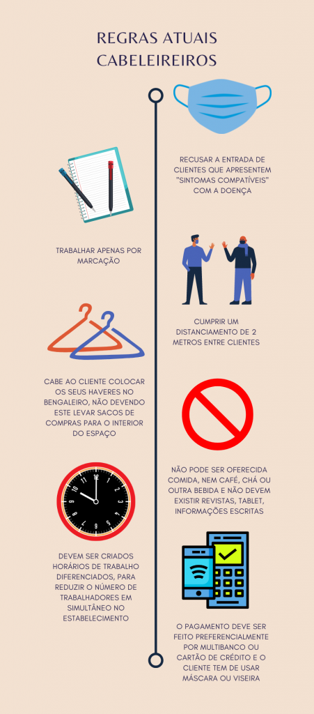 A 2 de maio os os cabeleireiros e cafés reabriram as portas, depois de terem visto a atividade suspensa devido à pandemia da COVID-19. Num comunicado enviado às redações, dias antes da reabertura, o presidente da Associação de Cabeleireiros diz que foi desenvolvido um documento de “compromisso do setor”, que inclui um conjunto de regras e recomendações essenciais para a retoma de atividade dos estabelecimentos. Várias regras estão a ser seguidas, nomeadamente a marcação prévia e a imposição do número de pessoas dentro dos salões. O #infomedia sabe que mais de 38 mil salões de cabeleireiro e institutos de beleza empregam mais de 50 mil pessoas. Depois do primeiro confinamento, 20% dos cabeleireiros em Portugal fecharam as portas.