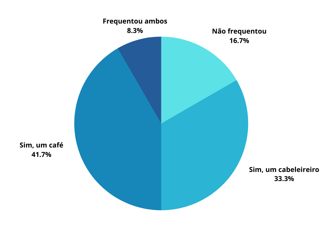 Quanto aos cafés, o questionário revelou que, surpreendentemente, 66.7% consumiram dentro do estabelecimento. Todas as respostas a que tivemos acesso indicaram que os clientes se dirigiam aos cafés para ingerir bebidas, o que nos leva a refletir sobre o que é ou não um bem de primeira necessidade. Já nos cabeleireiros, o serviço mais procurado foi o corte de cabelo.
