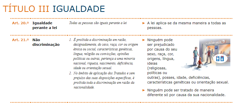 Segundo a Carta dos Direitos Fundamentais da União Europeia, há um reforço da proteção dos cidadãos. Um dos valores essenciais que se funda e que está consagrado no artigo 2.º do Tratado da União Europeia é a igualdade.