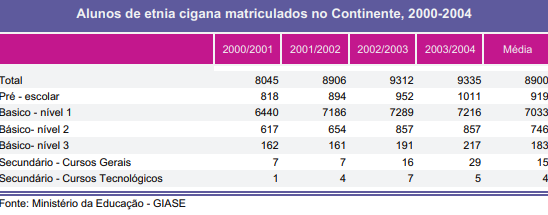 Segundo o Ministério da Educação, entre 2000 e 2004, o número de alunos de etnia cigana aumentou no acesso ao ensino para cerca de 9335 alunos. No entanto, houve uma diminuição no número de matriculados no secundário, em cursos tecnológicos. No ensino básico, nível 2, entre 2002 e 2004, o número de matriculados manteve-se, bem como entre 2000 e 2002 no ensino secundário, em cursos gerais.