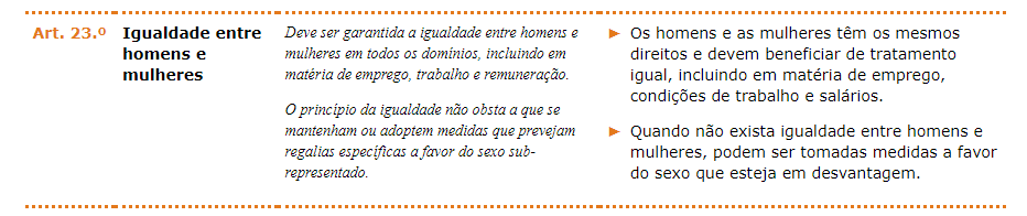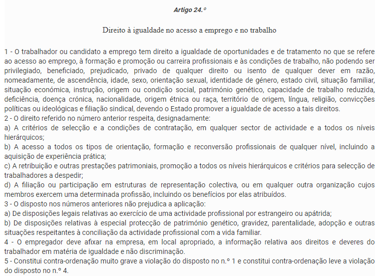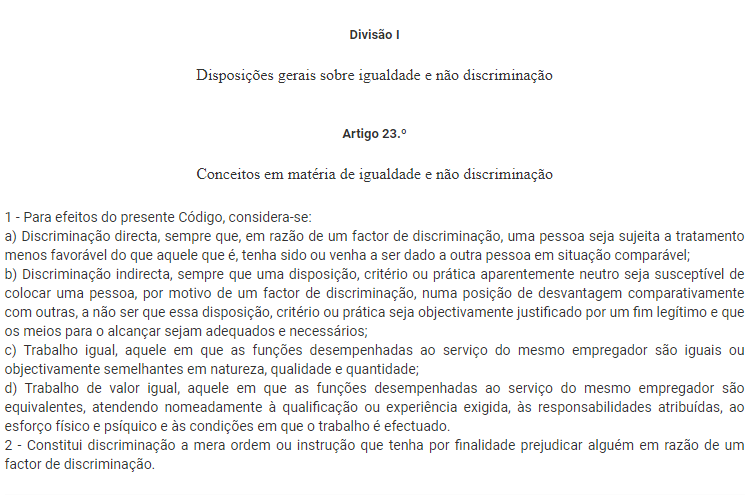 De acordo com o Diário da República, na subsecção III, Igualdade e não discriminação, está presente o artigo 23.º- Conceitos em matéria de igualdade e não discriminação e o artigo 24.º- Direito à igualdade no acesso a emprego e no trabalho.