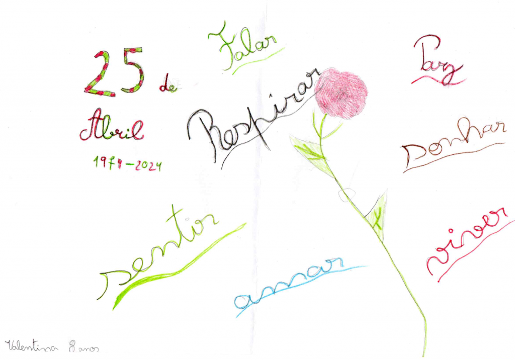 Valentina Vieira, 8 anos, da geração alfa, explica a sua compreensão do 25 de Abril e fala sobre o desenho que fez especialmente para esta reportagem.