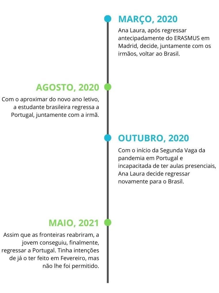 Quando a COVID-19 se começou a espalhar pelo mundo a estudante brasileira foi apanhada de surpresa, “estava de Erasmus, ia ficar 6 meses em Madrid”, mas logo voltou para Portugal porque os seus irmãos vivem cá. Em conjunto decidiram voltar para o Brasil, para junto dos seus pais, e viajaram em março de 2020. Foi no mês de agosto, desse mesmo ano, que decidiram “voltar para Portugal, porque iam começar as aulas e ia ser presencial”, porém, não ficaram durante muito tempo, sendo que “a segunda vaga foi logo em outubro” e a estudante ficou com bastante receio, uma vez faz parte de um grupo de risco. Conta que fez “exames médicos e o doutor, falou que deveria evitar ir para a faculdade e estar em transportes públicos”, cedeu-lhe “um atestado que comprovava que eu teria de ficar em regime on-line”. Foi nessa altura que tomou a decisão de voltar novamente para o Brasil. Regressou a Portugal apenas em maio de 2021, quando as fronteiras reabriram, mas, garante que, já se sente “muito mais segura em estar cá”.