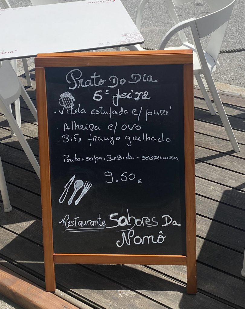 À chegada, é impossível não reparar na esplanada acolhedora, onde um quadro de giz exibe os pratos do dia, num detalhe simples mas cativante. Fomos prontamente abordados por um dos membros da família, Guilherme, o filho da proprietária. Pouco tempo depois, juntaram-se a própria Leonor e a sua nora Tânia, num gesto caloroso que reforçou o ambiente familiar e acolhedor do espaço.