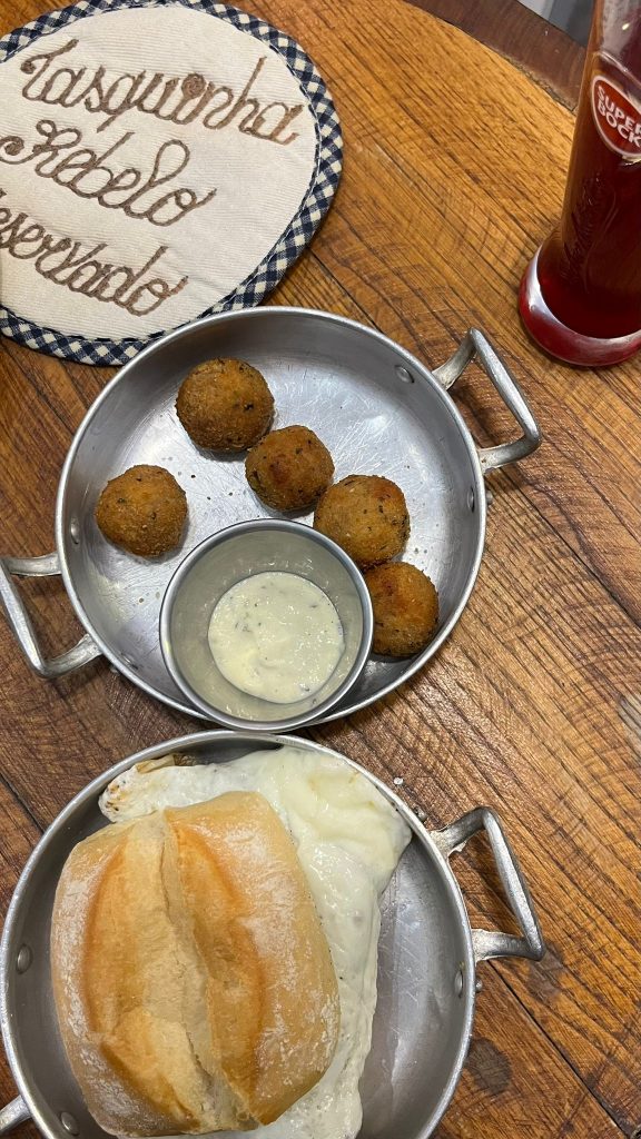 Essa essência também se reflete no cardápio, que mistura pratos tradicionais portugueses com criações originais e influências internacionais. Pratos como a “Pita Ardida” ou os “Ovos Rotos” ganham destaque pela criatividade e sabor. “As vezes vou jantar fora de Portugal, ou Grécia e vejo um prato que até gosto e digo ‘Oh isto é bom para a minha tasca, vou inventar’”. Fátima assegura que está sempre a inventar, experimenta pratos de outros países e acaba por lhes dar um toque pessoal.