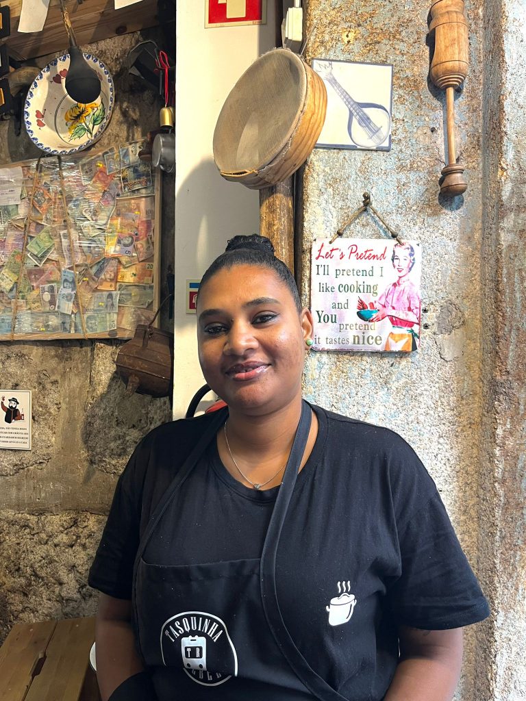 Um exemplo marcante é a história de Linda dos Santos, uma jovem de Cabo Verde que Fátima acolheu depois de uma viagem de férias. “Toda a gente merece uma oportunidade,” diz Fátima, que também se envolve em voluntariado e ajuda aos sem-abrigo. Linda contou-nos que está “aqui há um mês a trabalhar” porque conheceu a dona daqui da Tasquinha em Cabo Verde. “Gostou de mim, eu disse que estava a precisar de emprego e de um lugar para estar. Então disponibilizou a sua casa, arranjou-me emprego e estou aqui. Eu acho que é um anjo que caiu do céu.” Apesar de estar há apenas um mês, já reconhece o dinamismo do espaço e aprecia pratos como os “Ovos Rotos” e a “Pita Ardida”. Linda acrescenta: “As pessoas aqui são muito simpáticas, e o trabalho, embora cansativo às vezes, passa rápido porque o ambiente é bom.”